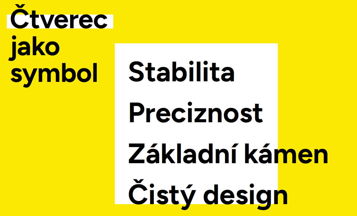 Žlutá barva zůstává naším klíčovým prvkem, nově si hrajeme i se highlightem textu a motivem čtverce.